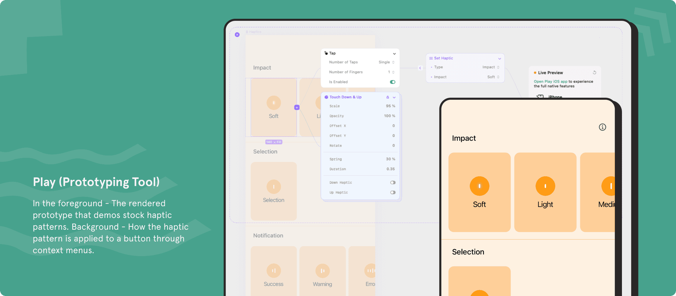 Play [https://createwithplay.com/] is a prototyping tool that happens to be great at haptics too. To get up and running, download the desktop and iOS apps and on the desktop app, look in Templates for the Haptics project. Take some time to familiarize yourself with how to pair up the desktop and mobile app, but once you do, what does the Haptics project show you? You betcha, it's all the stock iOS haptics presented as handy buttons where you can feel these haptics firsthand (no pun intended). This is another great way to demo haptics for your engineering partners. To get the full gist of how haptics are setup in Play, this quick video will get you going with everything you need to know.