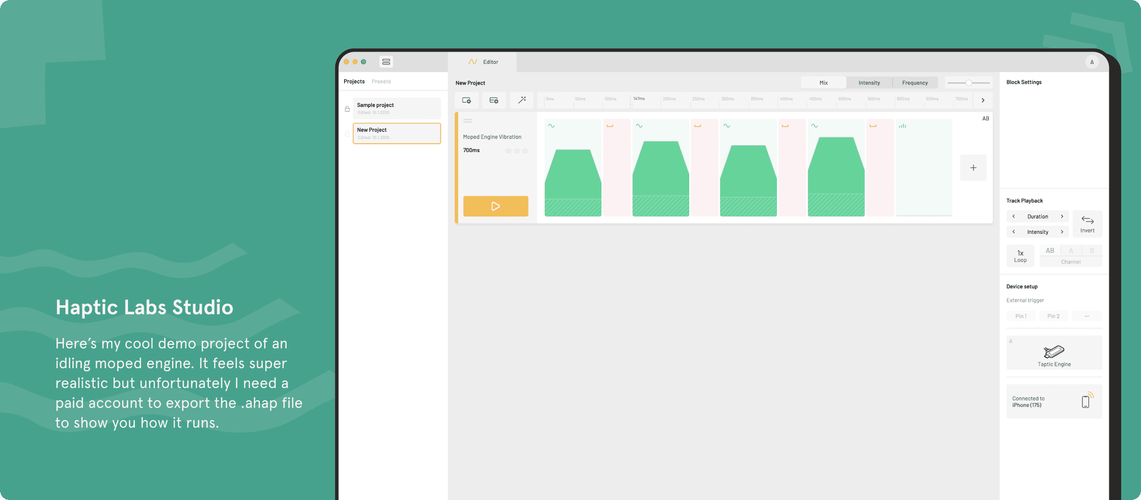 With Haptic Labs Studio, I was able to quickly create a custom haptic that feels like an idling moped engine. If you’ve ever edited video or authored music in a software app, the feel of “drawing” a haptic pattern is much the same. The app utilizes a timeline based canvas where different high level patterns can be added (pulse, vibrate, pause, and even audio) and then customized through variables like intensity, duration and a ton more. Added bonus — the patterns you generate in Haptic Labs Studio can be exported as .ahap files (with the right plan) and imported into Play for demonstrations and prototyping.